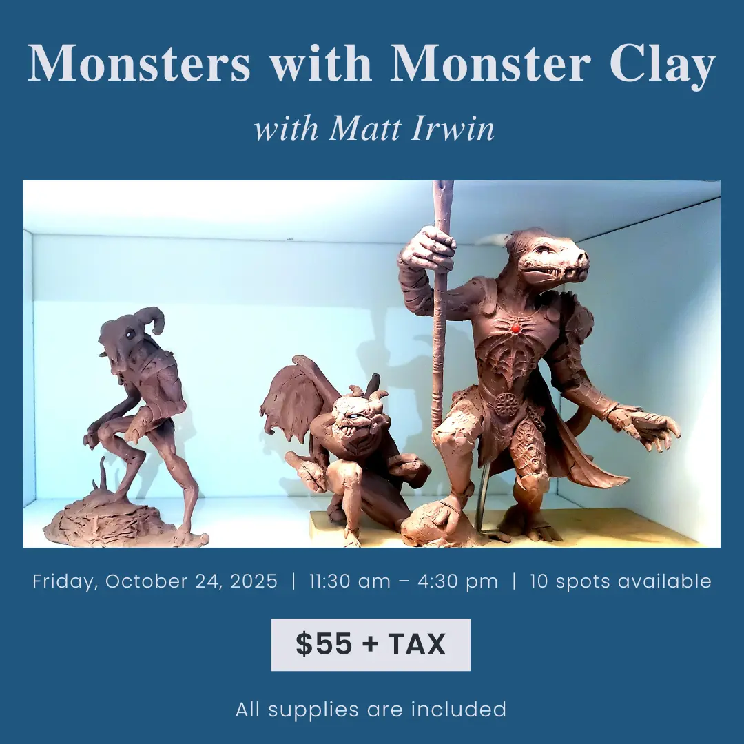 Each student will receive ¼ tub of hard Monster Clay. The instructor will provide all tools, bases, and supplies needed. Students are encouraged to bring or purchase their own sculpting tools and creative materials to personalize their piece.